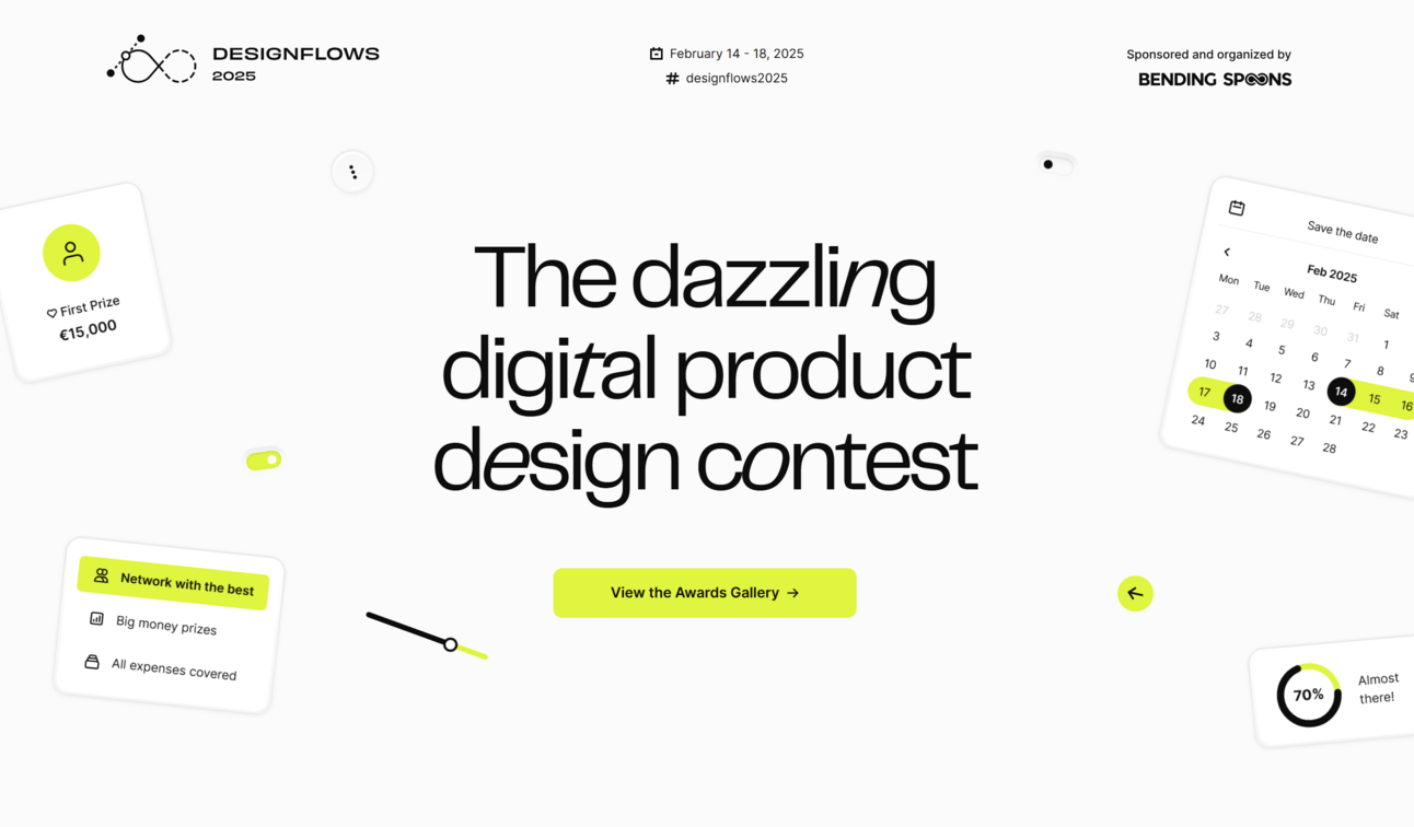 Clean, bold, and buzzing with creative energy. Big playful text, floating elements, and pops of neon yellow give it the vibe of a design festival that’s as fun as it is serious about great work.